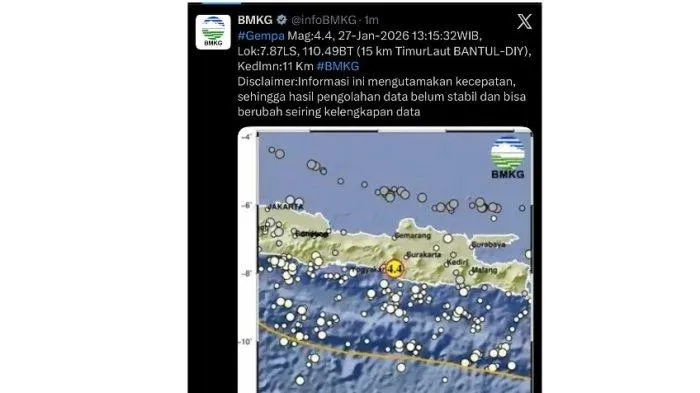 Bdgtoday.com /DIY Gempa bumi bermagnitudo 4,4 mengguncang wilayah DIY pada Selasa (27/1/2026) siang pukul 13.15 WIB.